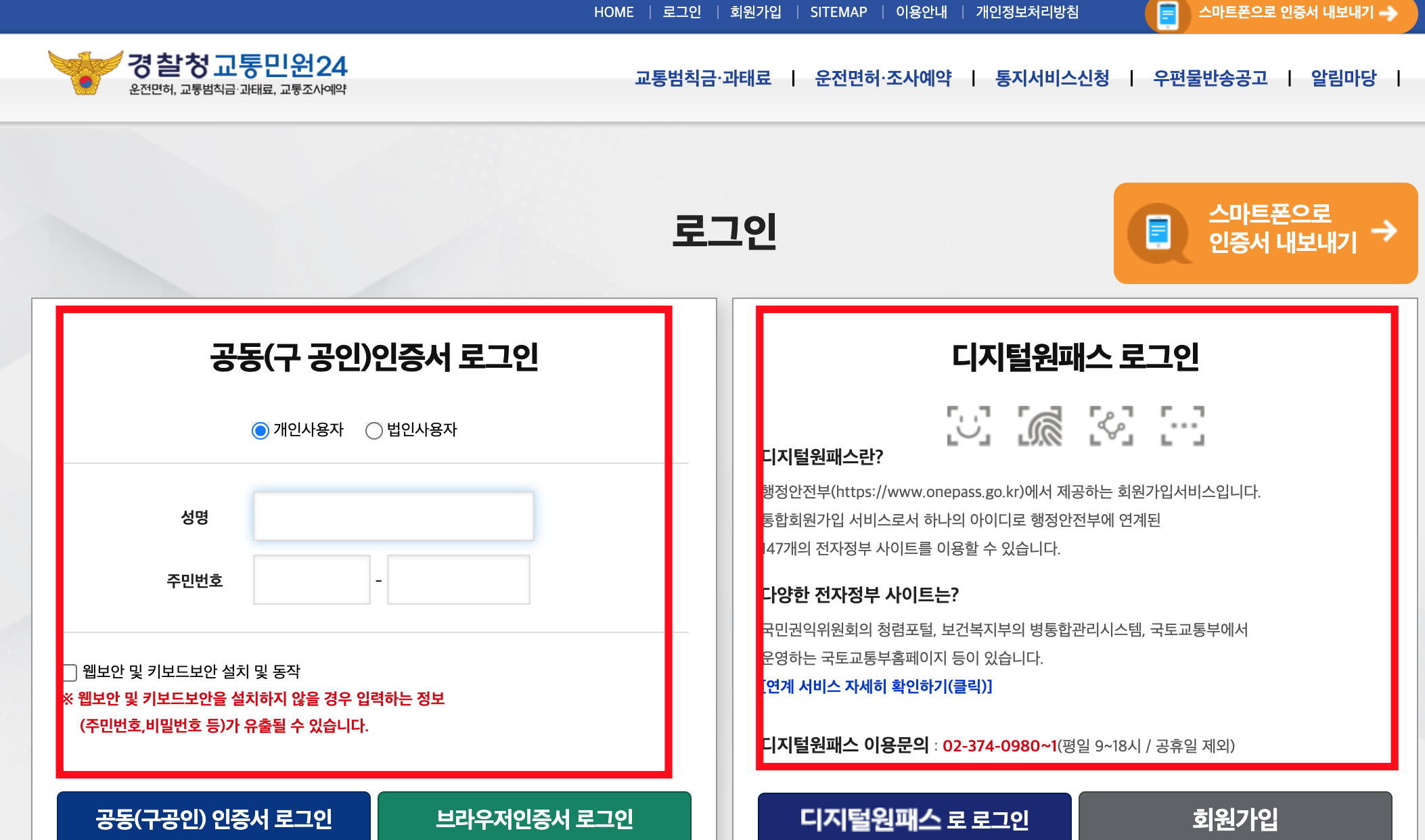과태료 내역은 개인정보이기 때문에 보안이 중요합니다. 공인인증서 또는 디지털 원패스를 통해 로그인을 하시면 됩니다. 휴대폰에서도 로그인이 가능하지만 인증서를 복사하는 번거로움이 있습니다.