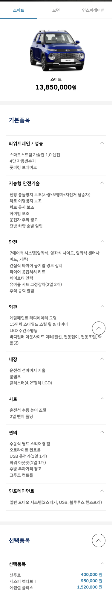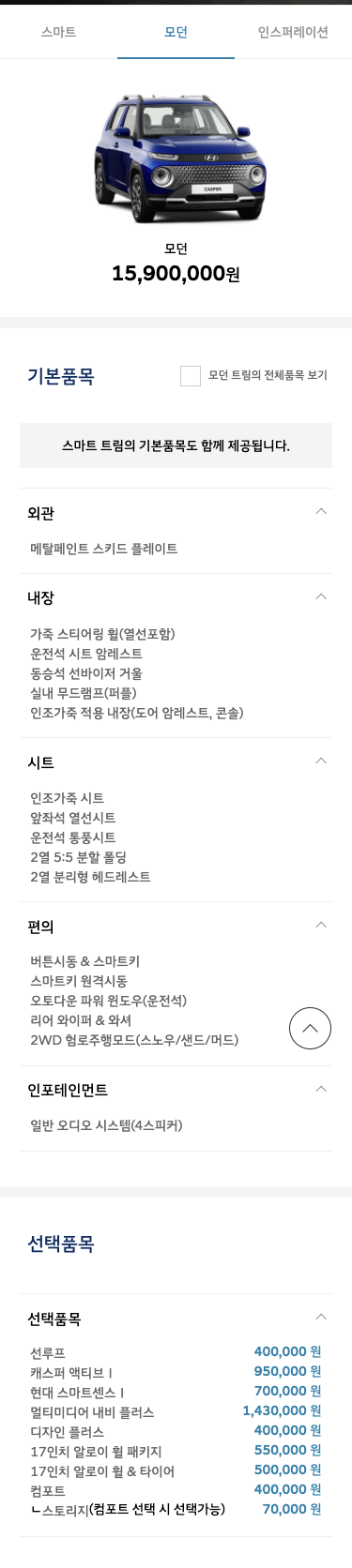 가격 때문에 말이 많더라구요. 캐스퍼의 등급은 스마트, 모던, 인스퍼레이션이지만 사실상 소비자의 선택지는 두 가지인데요.