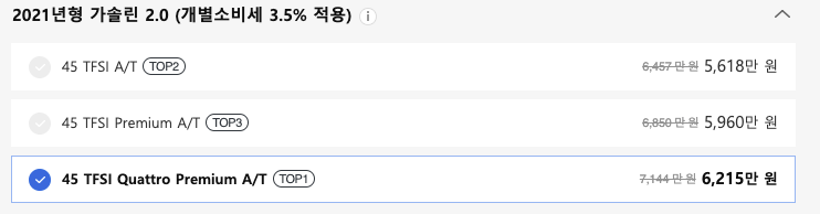 그 다음은 45 TFSI 프리미엄, 45 TFSI 순입니다.